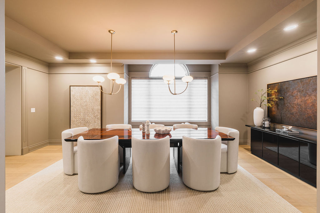 The palette is composed of off-white and warm neutral tones that echo the lighter elements within the space, including the rug and dining chairs. These softer hues bring brightness and openness to the room, providing balance against the depth and weight of the darker companion piece.